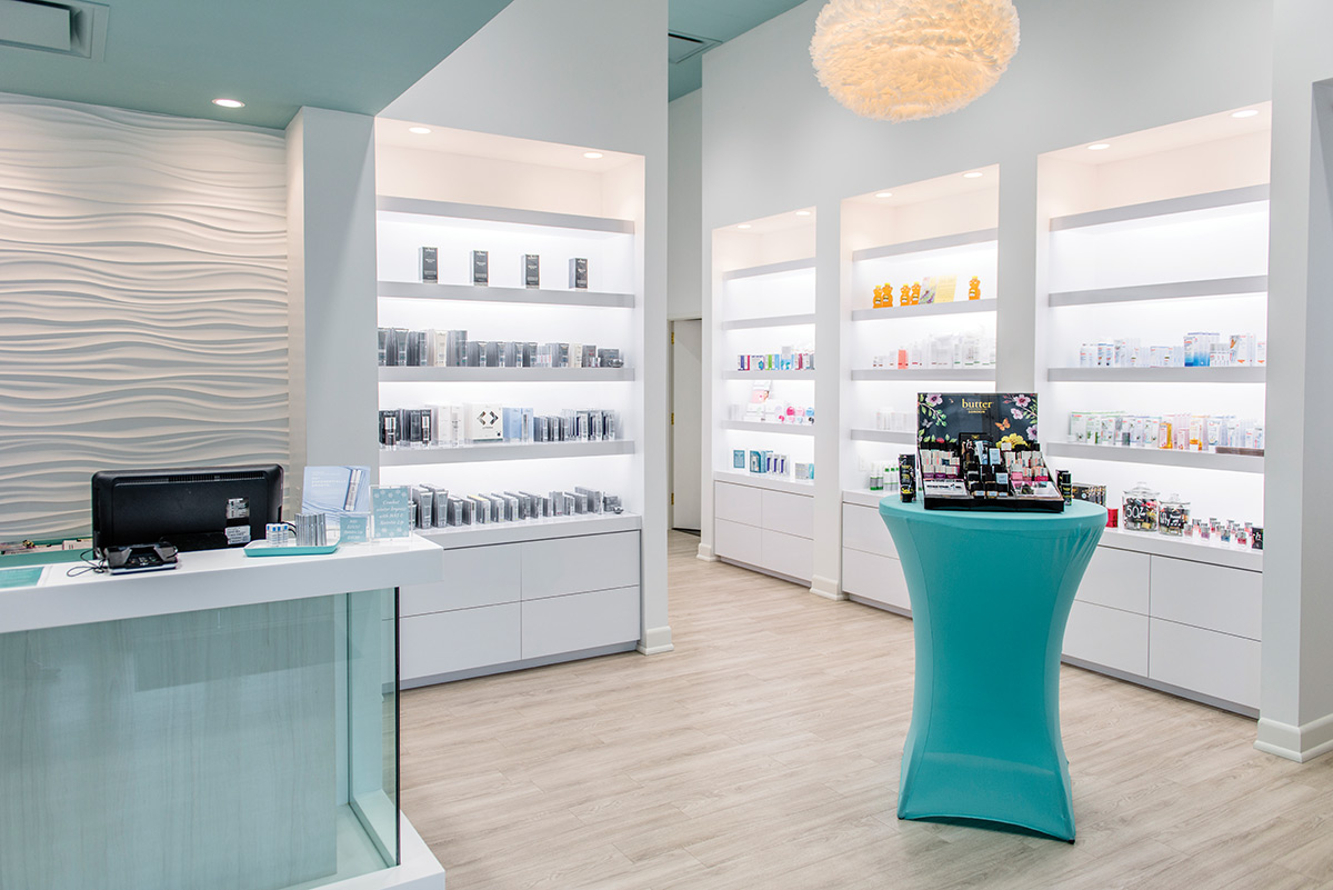 The layout of the building also achieves this effect. The main room contains a styling area and comfortable seating with a doorway leading to massage rooms. Manicure and pedicure stations are to the right, and to the left is a cozy waiting room with a soothing faux fireplace. That’s also where you’ll find the entrance to the medical esthetics area. This separation allows clients who are only visiting for non-medical spa needs to avoid clinical aesthetics entirely.