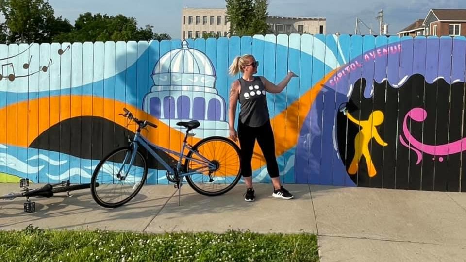 Located just behind “Playing on the Breeze” at the 619 E. Capitol Ave, “Happy HQ Hippo” was comissioned by Holly Stitt and painted by artist Alex Eickhoff (below) in an effort to beautify the badly damaged area one year after the 2019 tornado. Alex painted this piece as a special favor to Holly and Avenue HQ, knowing that hippos have a special place in their hearts.