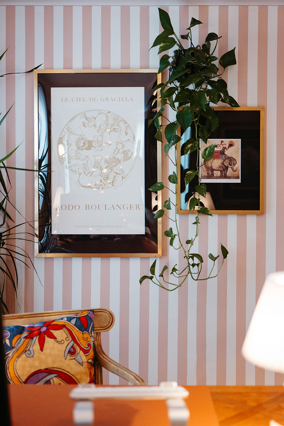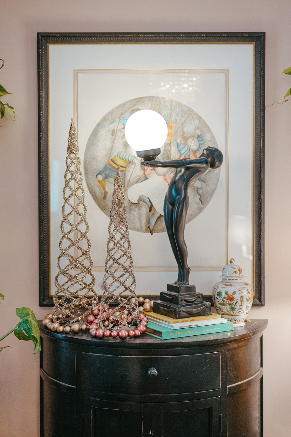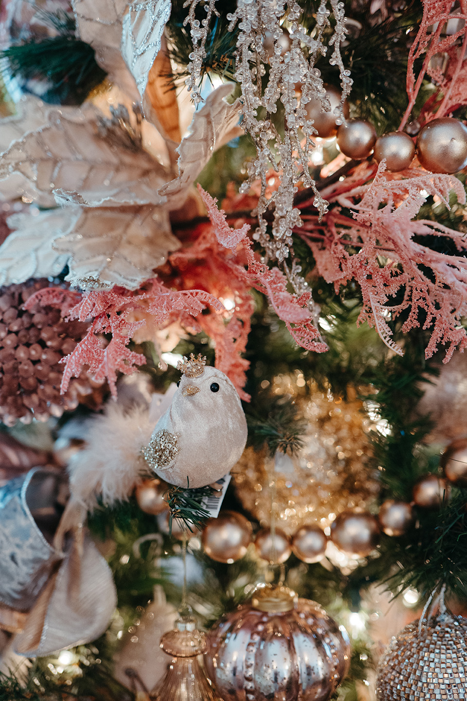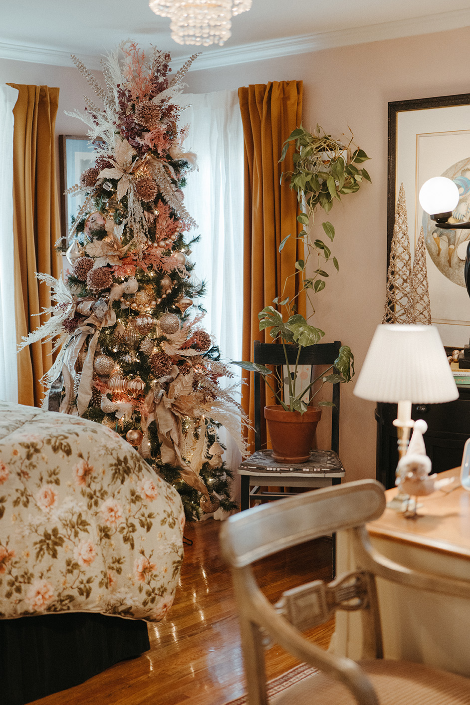 In the guest bedroom, which doubles as a second office, Busch’s Florist & Greenhouse opted for a more modern Christmas tree design that complements the room’s vintage pink color palette. Here, the designers used various shades of pink, beige, rose gold, and peach ornaments, along with shimmering floral stems, and painted pinecones to make the room’s pink accents pop. Similar to the other trees and garlands throughout the home, soft ivory lights were used to illuminate the metallic hues of the decor, ensuring that each element radiates warmth and charm.