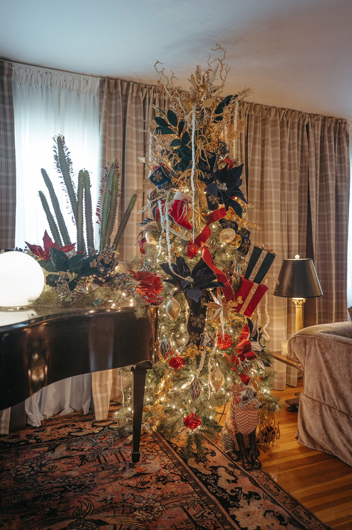 In the entertainment room, a magnificent Christmas tree takes center stage, adorned with rich dark navy and burgundy velvet poinsettias that complement the sleek black grand piano, leather couch, and curated artworks, creating a sophisticated gathering space.