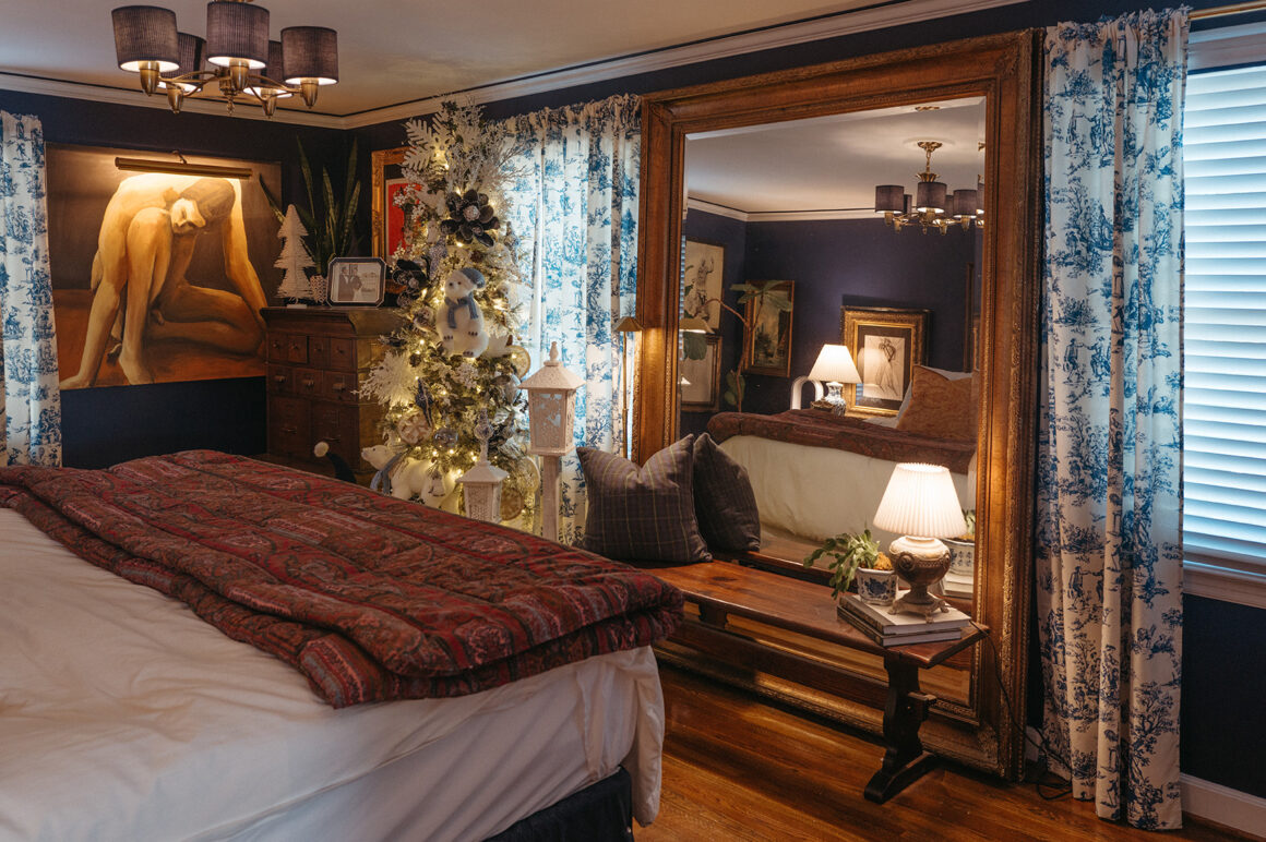 Upstairs, Kristina decided to work with each room’s complementary colors. Nestled in a corner of the master bedroom, the Christmas tree showcases white snowflakes, delicate birds, playful polar bears, and finial ornaments, accented with hints of powder blue that match the room’s French toile curtains