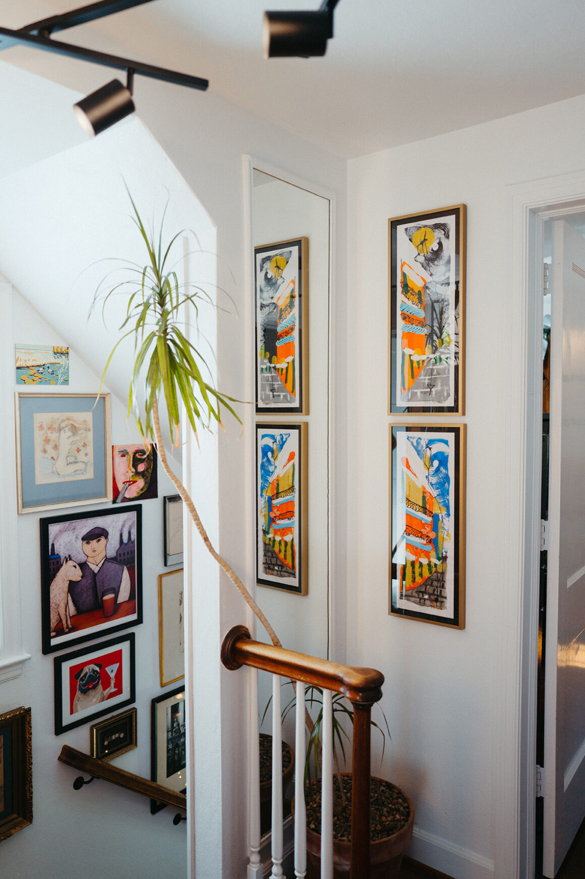 “The theme for this room is jewel tones,” Kristina says. To tie the room together, the same ornaments grace the garlands draped along the staircase and the fireplace mantel.
