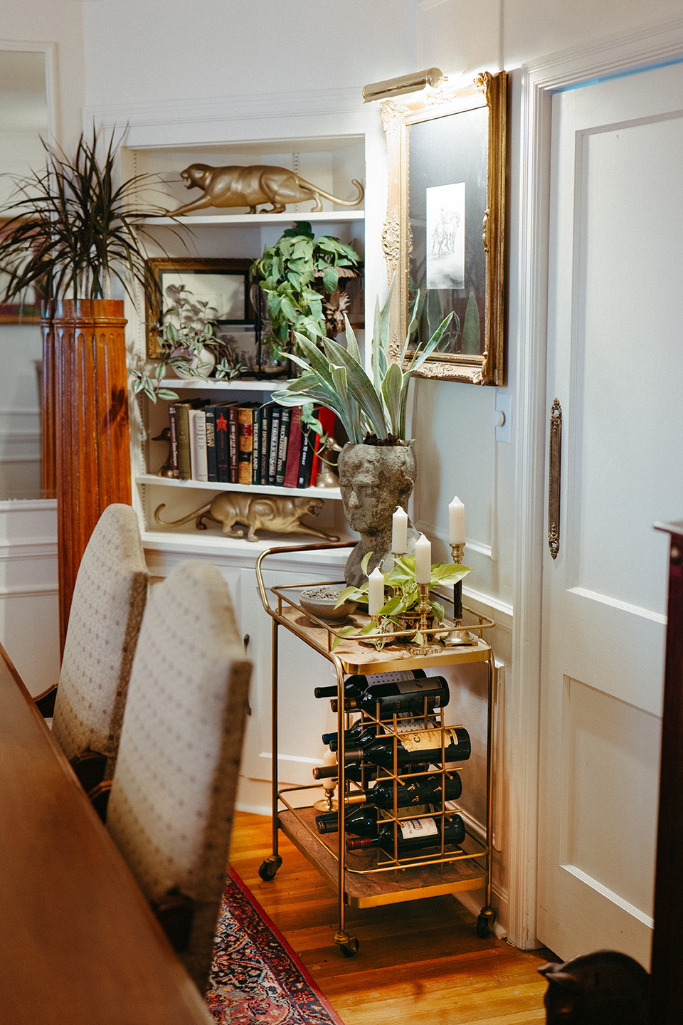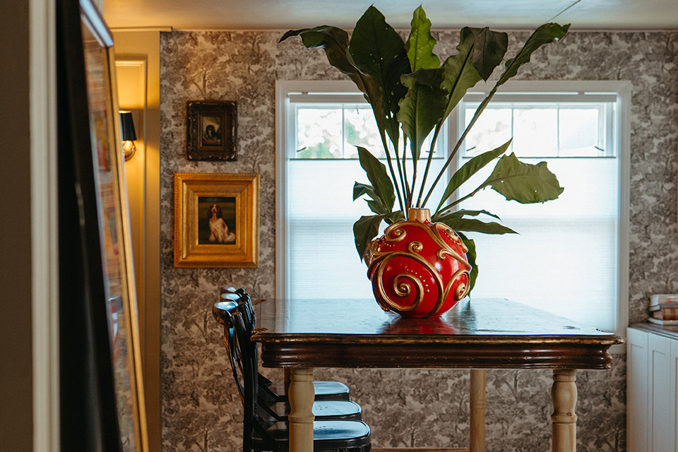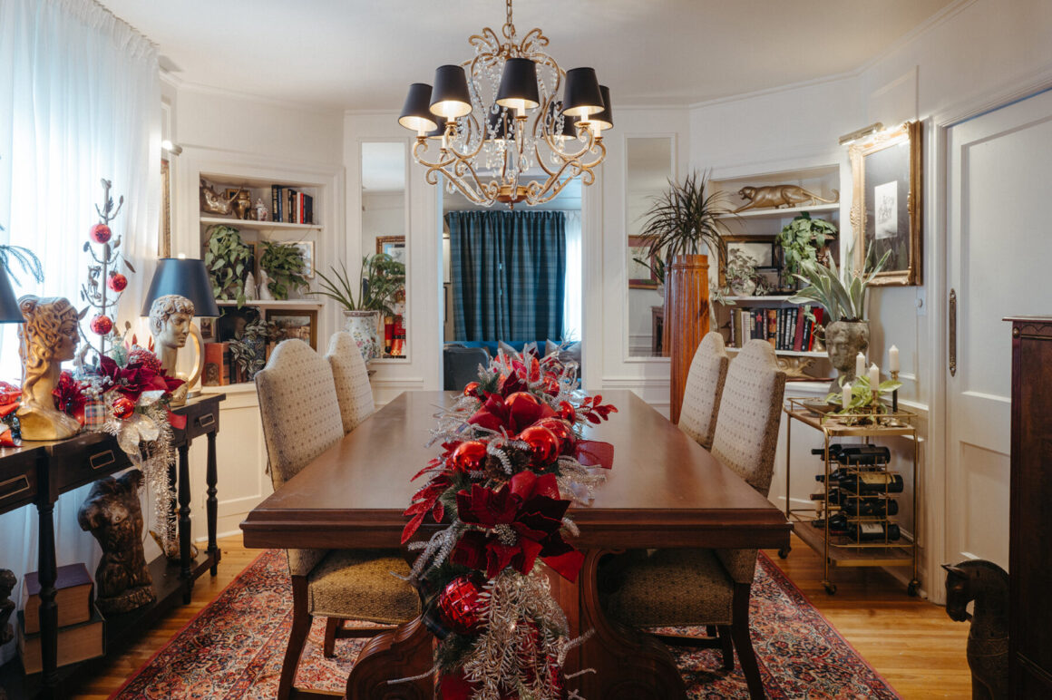 The dining room is perfectly set up for hosting festive gatherings, making every party a special occasion. In previous years, the homeowners opted for a modest floral arrangement as a centerpiece for the dining table. This year, however, Busch’s Florist & Greenhouse took it up a notch by using a lush garland with ruby red ornaments and shimmering champagne flower stems. This centerpiece not only enhances the length of the dining room but also creates a welcoming pathway leading guests into the adjacent seating area and kitchen.