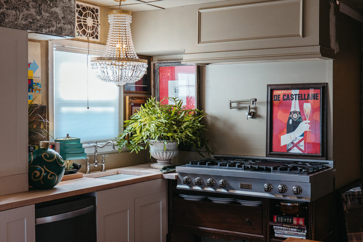 Moving into the kitchen, Busch’s Florist & Greenhouse’s designers chose a palette of green, champagne, and gold that beautifully contrasts the light gray forest wallpaper and checkered tile flooring. The kitchen, with its bold characteristics, is adorned with jumbo-sized ornaments that serve as stunning statement pieces without cluttering any workspace.
