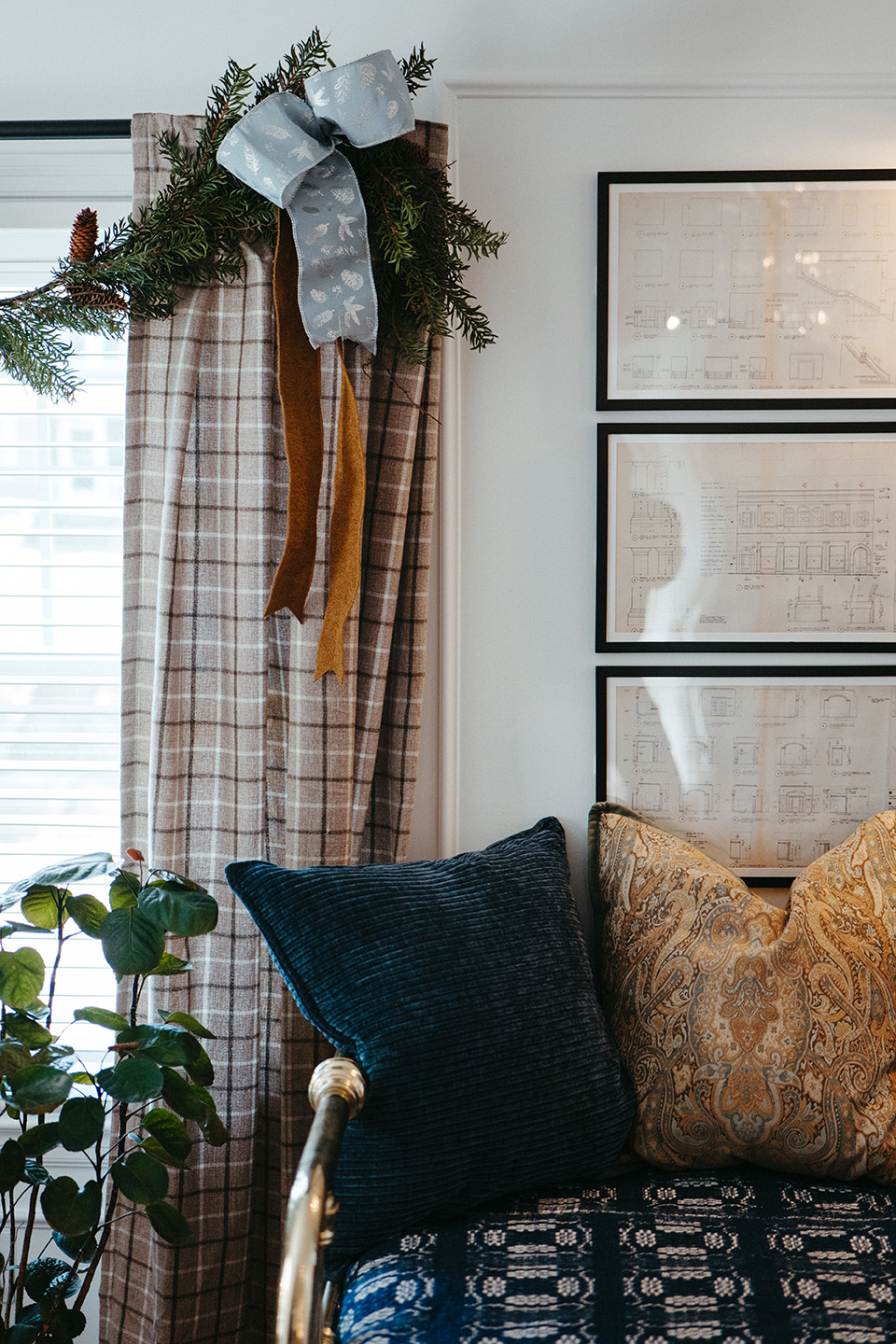 Across the hall in the small office space, Busch’s Florist & Greenhouse opted for a minimalist touch, adding just two pinecone garlands above the windows and a charming set of white wooden Christmas trees, seamlessly integrating with the room’s year-round color scheme
